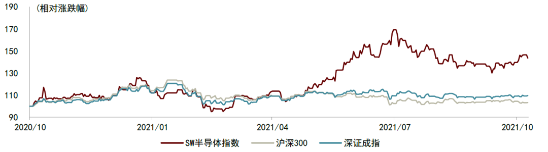 2020年底至今,疫情、自然灾害等多重因素交织,影响了全球半导体供应链,导致芯片短缺,手机、汽车、安防等行业均受到较大影响。缺货导致的芯片销售价格上涨使得芯片设计企业获得了较快的利润增速;制造端,晶圆厂、封测厂基本实现满产,ROE得以提升;同时伴随着国产化率提升,国内设备材料企业利润释放,1-3Q21产业链各环节均维持了较高的收入及盈利增速。受上述因素影响,半导体指数(申万行业分类)在2021年4月至7月之间显著跑赢大盘。但8月至10月板块整体出现阶段性回调,细分板块之间与板块内股价表现分化,我们认为主要是因为多重指标使得市场对2022年半导体行业各领域景气度的判断产生分歧。首先,下游市场需求出现结构性分化,汽车电子、新能源发电端(光伏、风电及储能)相关芯片需求旺盛,消费、通信相关芯片需求出现减弱趋势;其次,市场预计全球部分新增晶圆制造和封测产能将在2022年开出,因此市场担心对供需关系造成不利影响。