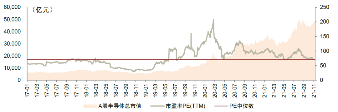图表:A股半导体板块市值与TTM P/E变化情况