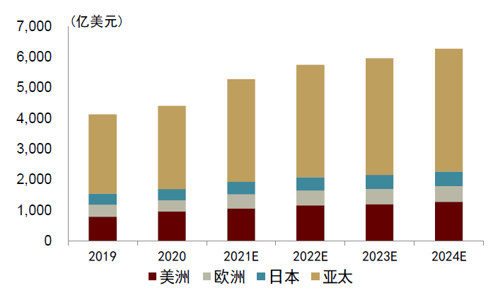 图表:全球半导体产值总额(按区域分)
