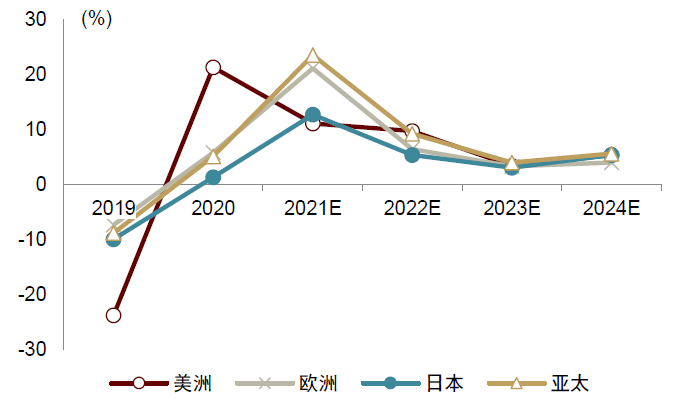 图表:全球半导体产值同比增速(按区域分)