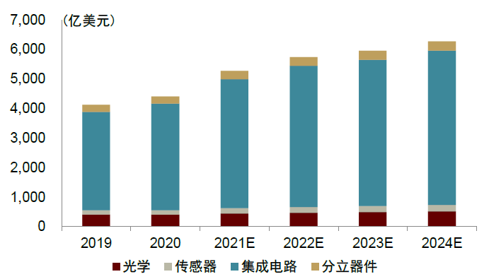 2021年全球半导体市场规模有望达到5272亿美元。WSTS预测,2021-2024年全球半导体总产值将达到5,272/5,734/5,949/6,271亿美元,同比增速分别为19.7%/8.8%/3.7%/5.4%,2020-2024年CAGR为9.2%。地区分布上看,WSTS预计到2024年美洲/欧洲/日本/亚太地区的半导体总产值分别为1,269/519/471/4,013亿美元。应用场景上看,WSTS预计到2024年光学/传感器/集成电路/分立器件的细分市场规模分别为520/210/5,229/312亿美元。