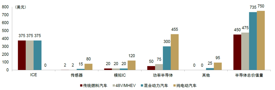 图表:不同汽车半导体价值量估算对比(2020年)